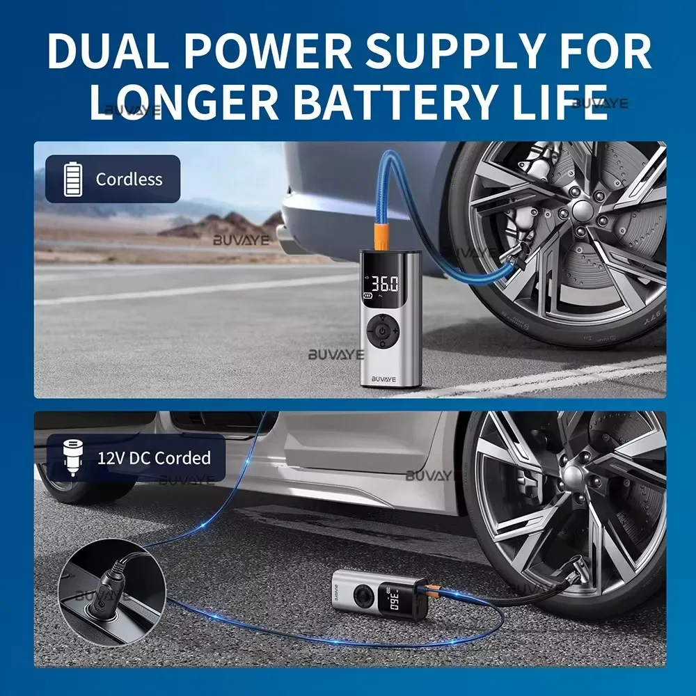 ¡El compresor de aire portátil tiene una presión máxima de 150 PSI y un flujo de aire de 20 L/min! Solo se necesitan 5 minutos para inflar por completo un neumático de automóvil (0-36 PSI) o 50 segundos para rellenar un neumático de automóvil en situaciones cotidianas (28-35 PSI), este inflador de neumáticos portátil para automóvil es definitivamente una buena ayuda para resolver emergencias en la carretera.