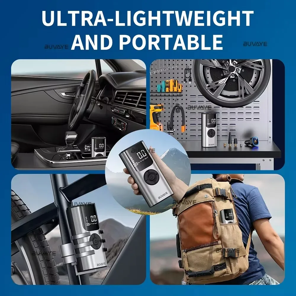 El inflador de neumáticos para automóvil tiene 4 modos de inflado preestablecidos (automóvil, bicicleta, motocicleta, balón), lo que facilita la elección para principiantes. El modo manual le permite establecer el valor de presión (5-150 psi) según el objeto que se esté inflando. Fácil de operar y usar, puede satisfacer sus diversas necesidades de inflado. Además, su pequeño tamaño hace que sea fácil de colocar en su automóvil, portabicicletas o mochila.