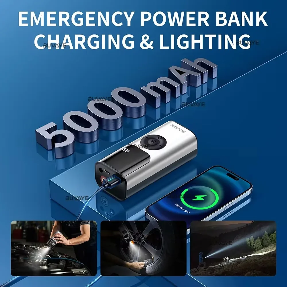 (1) Cuando la batería del dispositivo es suficiente, se puede utilizar directamente como una bomba de aire portátil. Además, la entrada tipo C de 5 V/2 A y el puerto de salida USB de 5 V/2 A lo convierten en una fuente de energía de emergencia para su teléfono móvil.