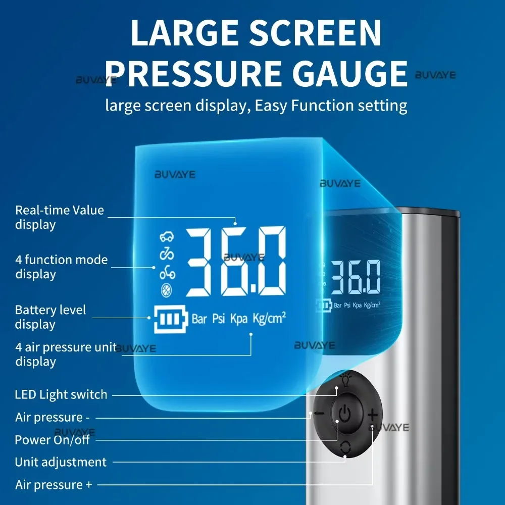 La gran pantalla LED muestra los valores de presión en tiempo real y los valores preestablecidos, lo que facilita la lectura y la observación del estado de la presión de los neumáticos. La presión máxima es de 150 PSI y la parada automática le brinda un inflado inteligente. No necesita preocuparse por inflar demasiado sus neumáticos.
