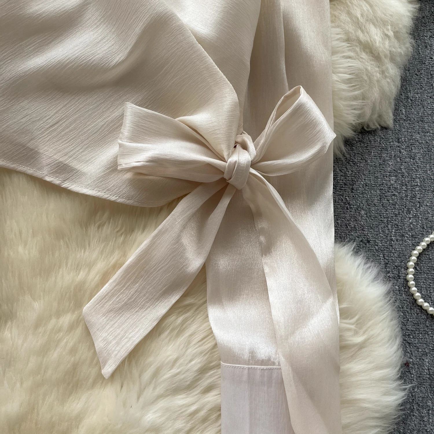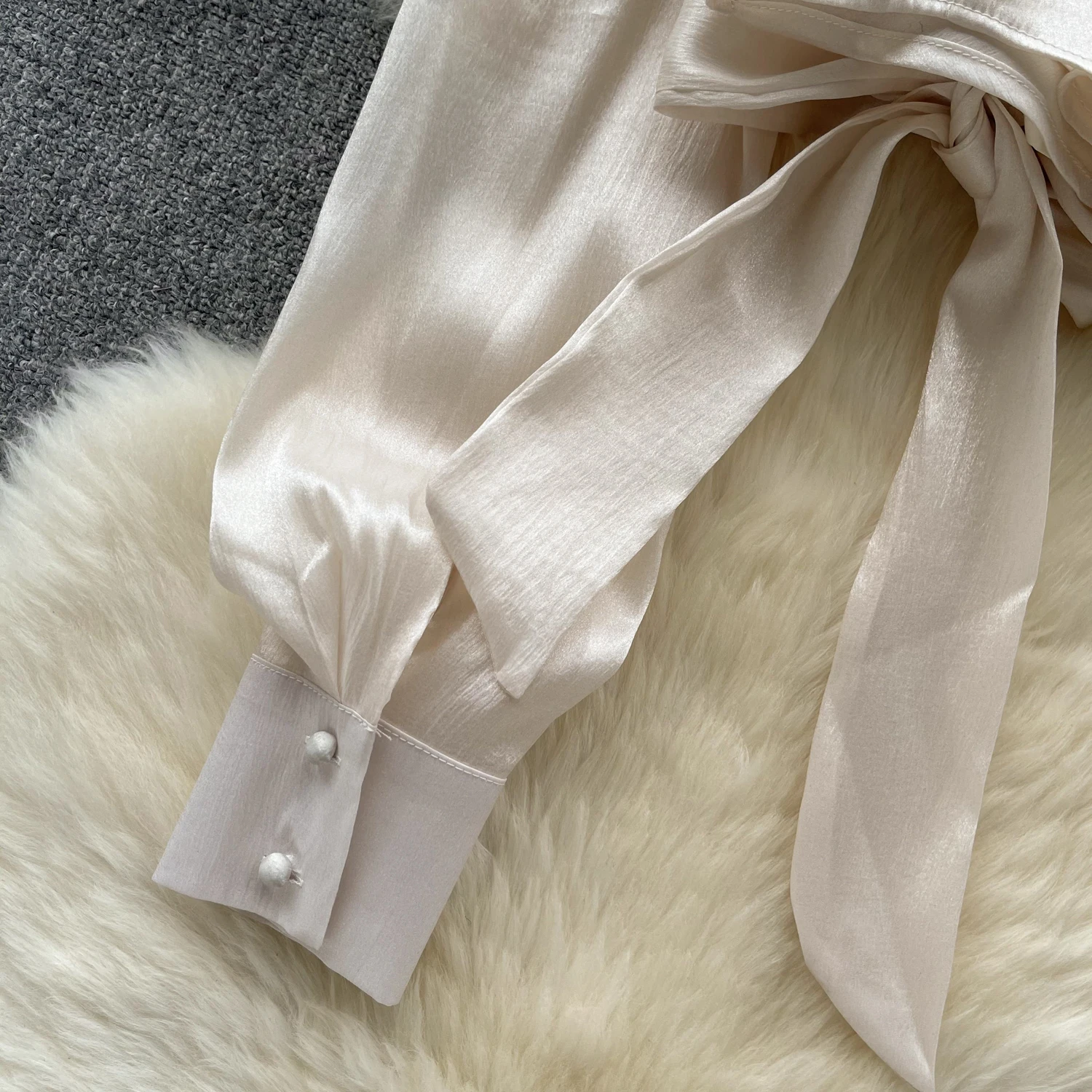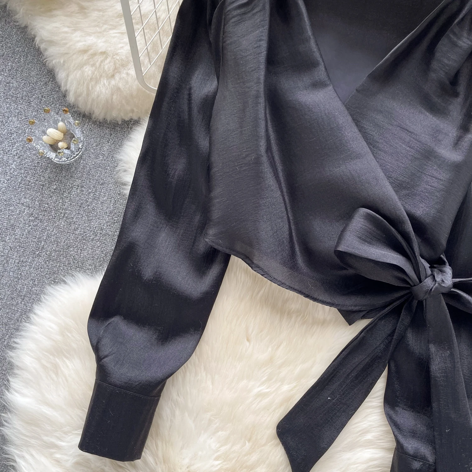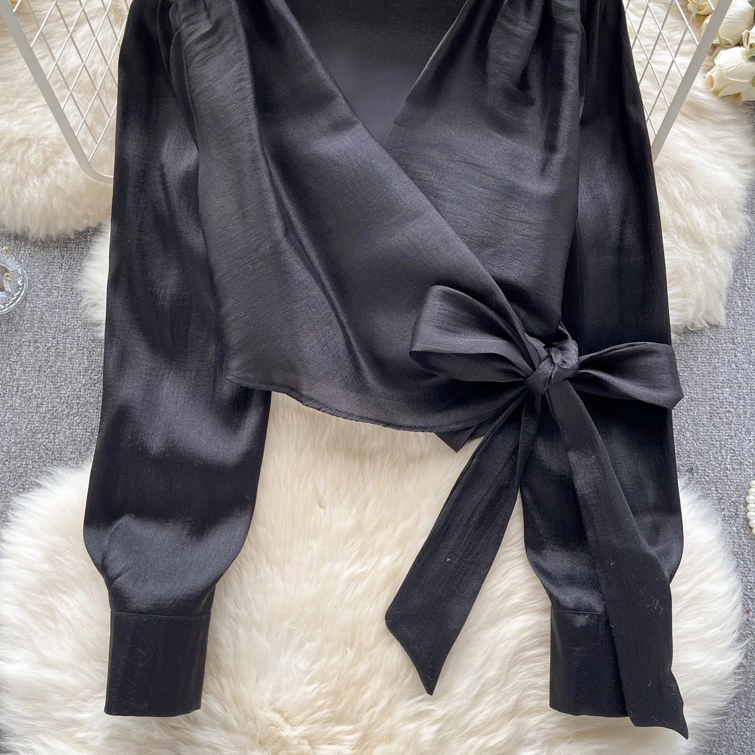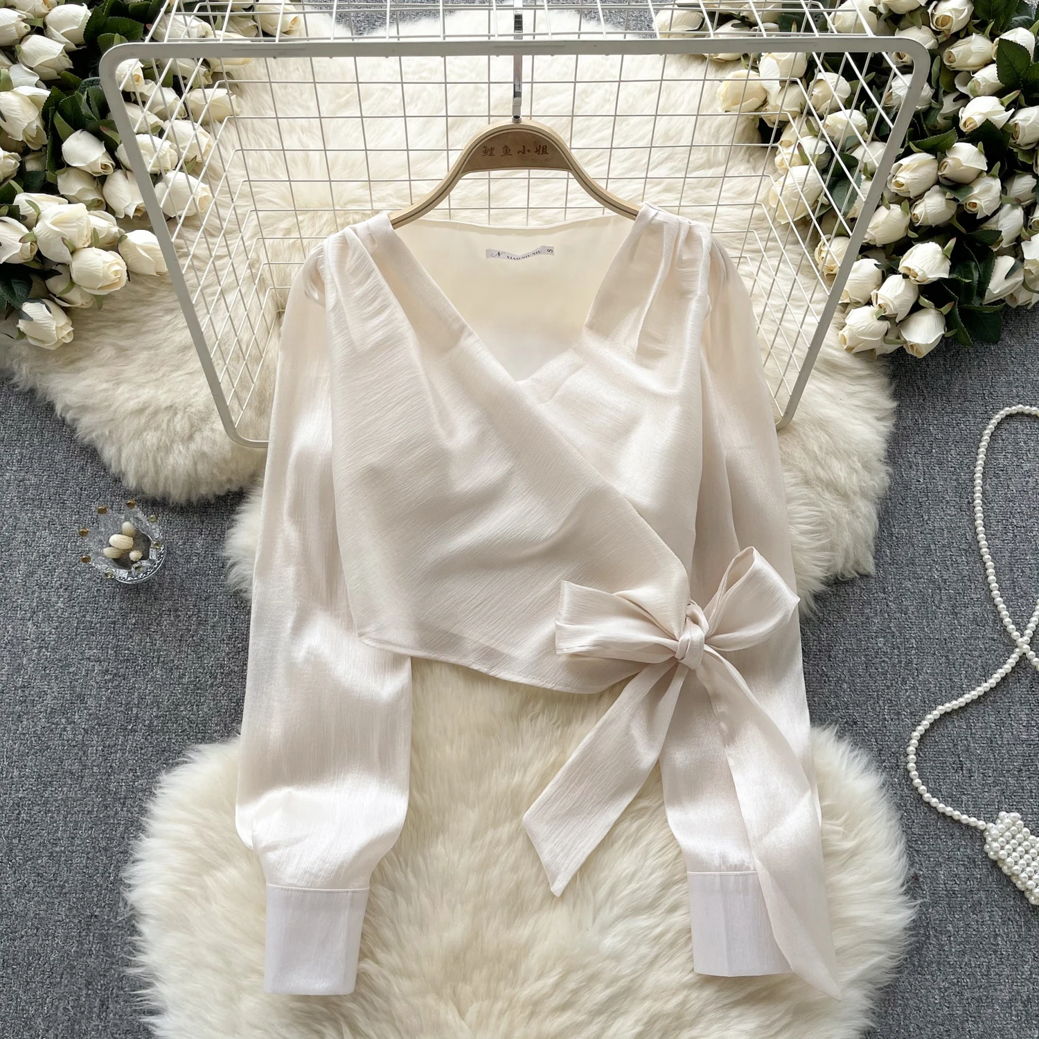 Camisa de vendaje con lazo cruzado Beige para mujer, ropa de diario francesa, Tops cortos formales con cuello en V, blusa elegante de moda, nuevo, otoño