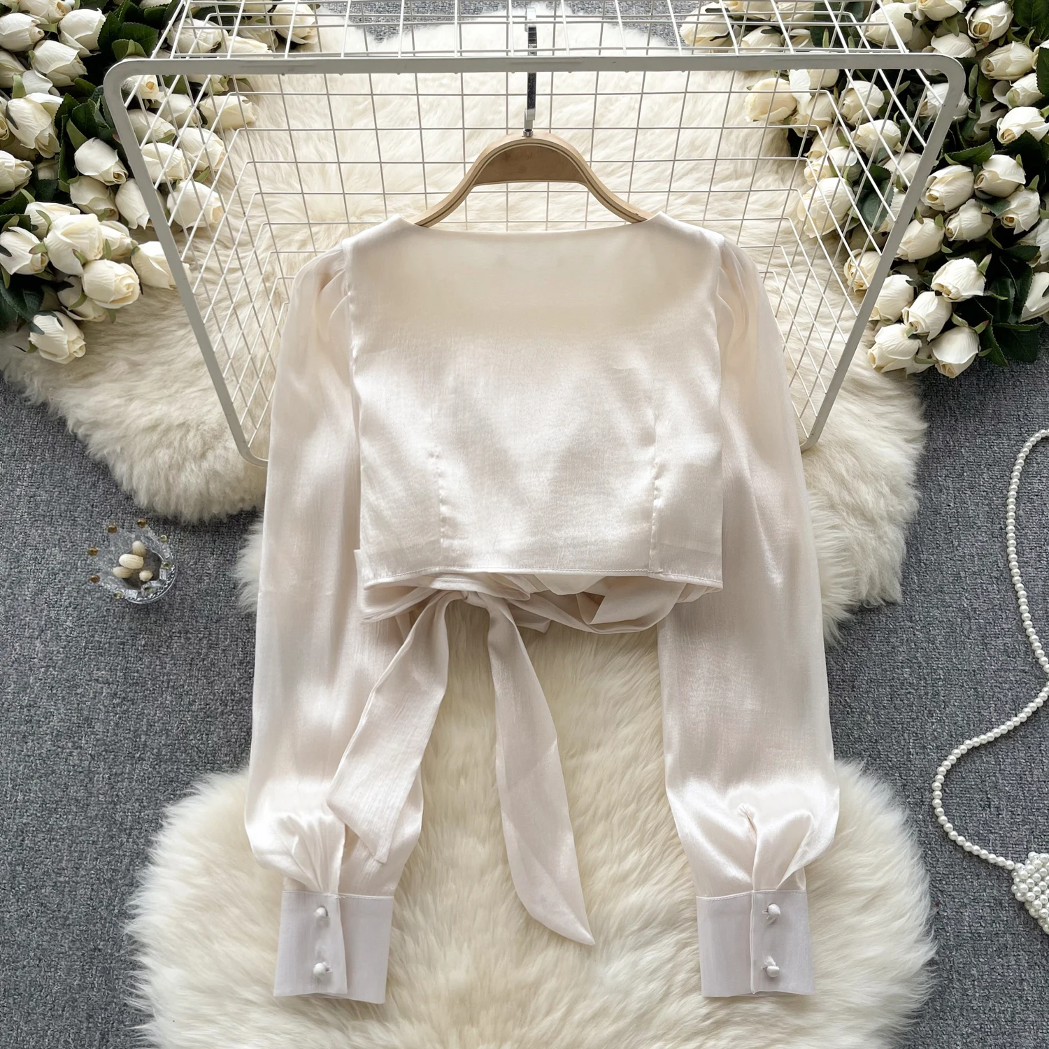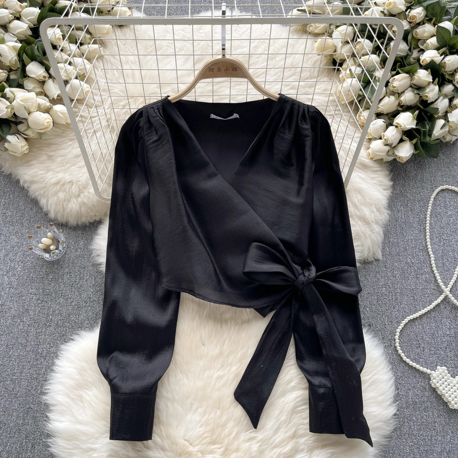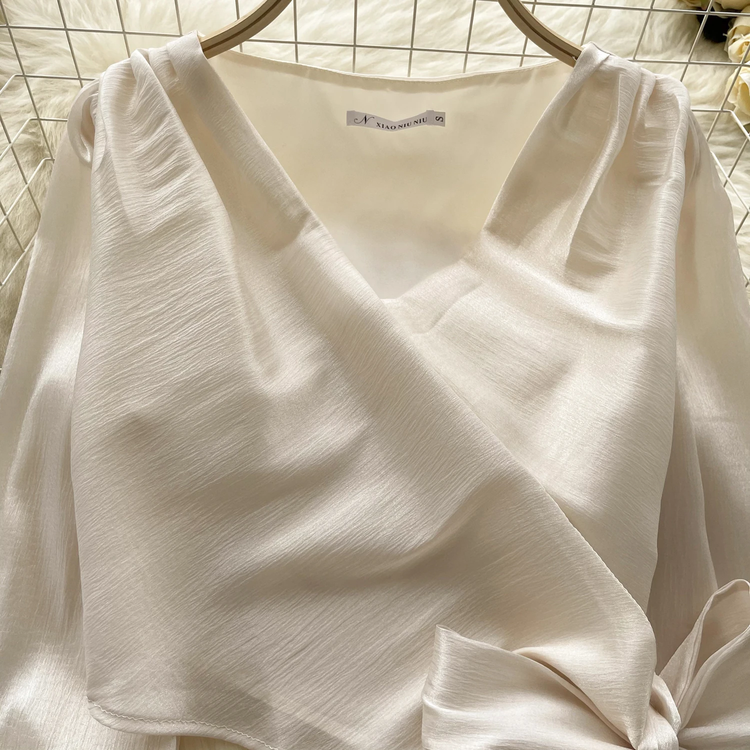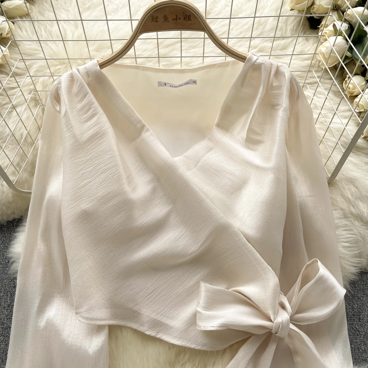 Sea el primero en opinar “Camisa de vendaje con lazo cruzado Beige para mujer, ropa de diario francesa, Tops cortos formales con cuello en V, blusa elegante de moda, nuevo, otoño”