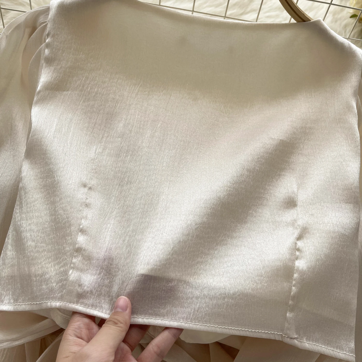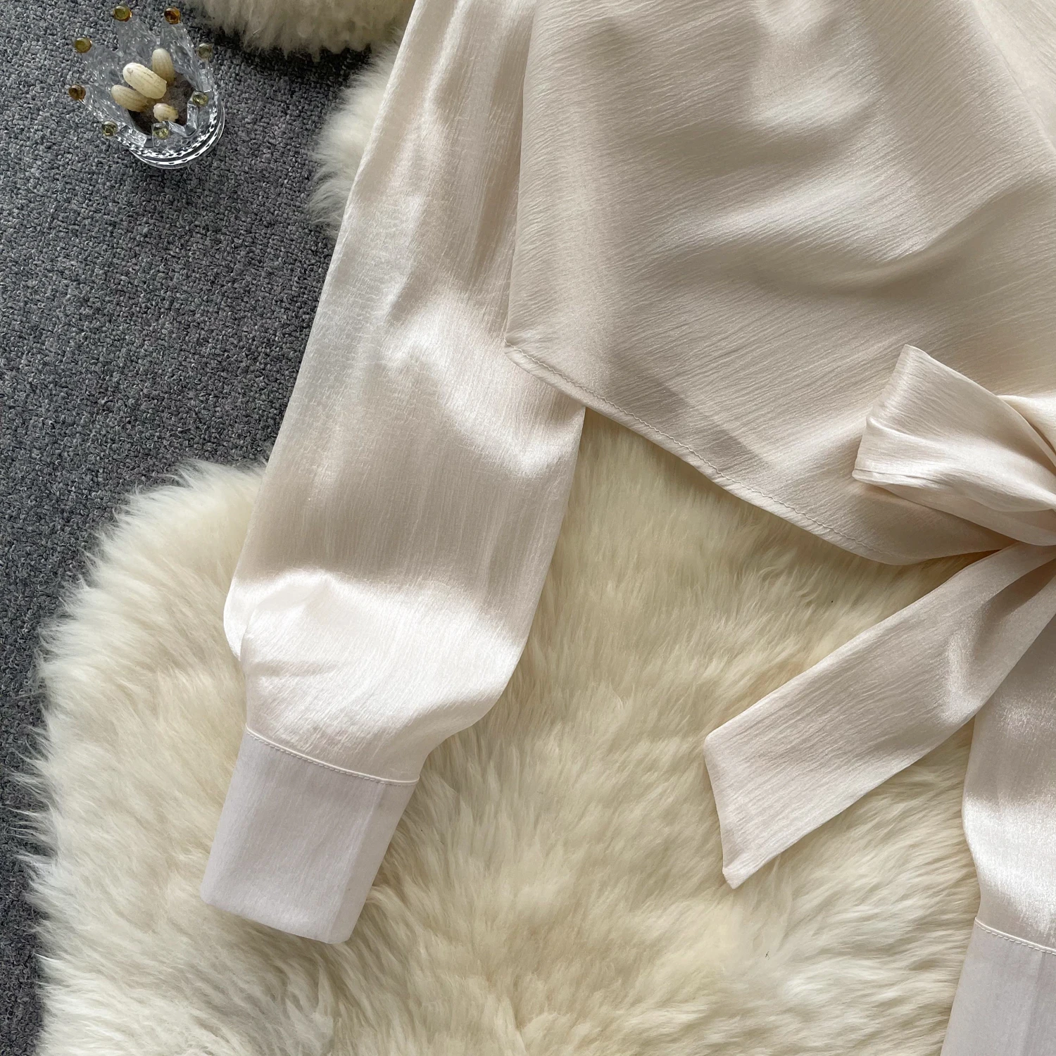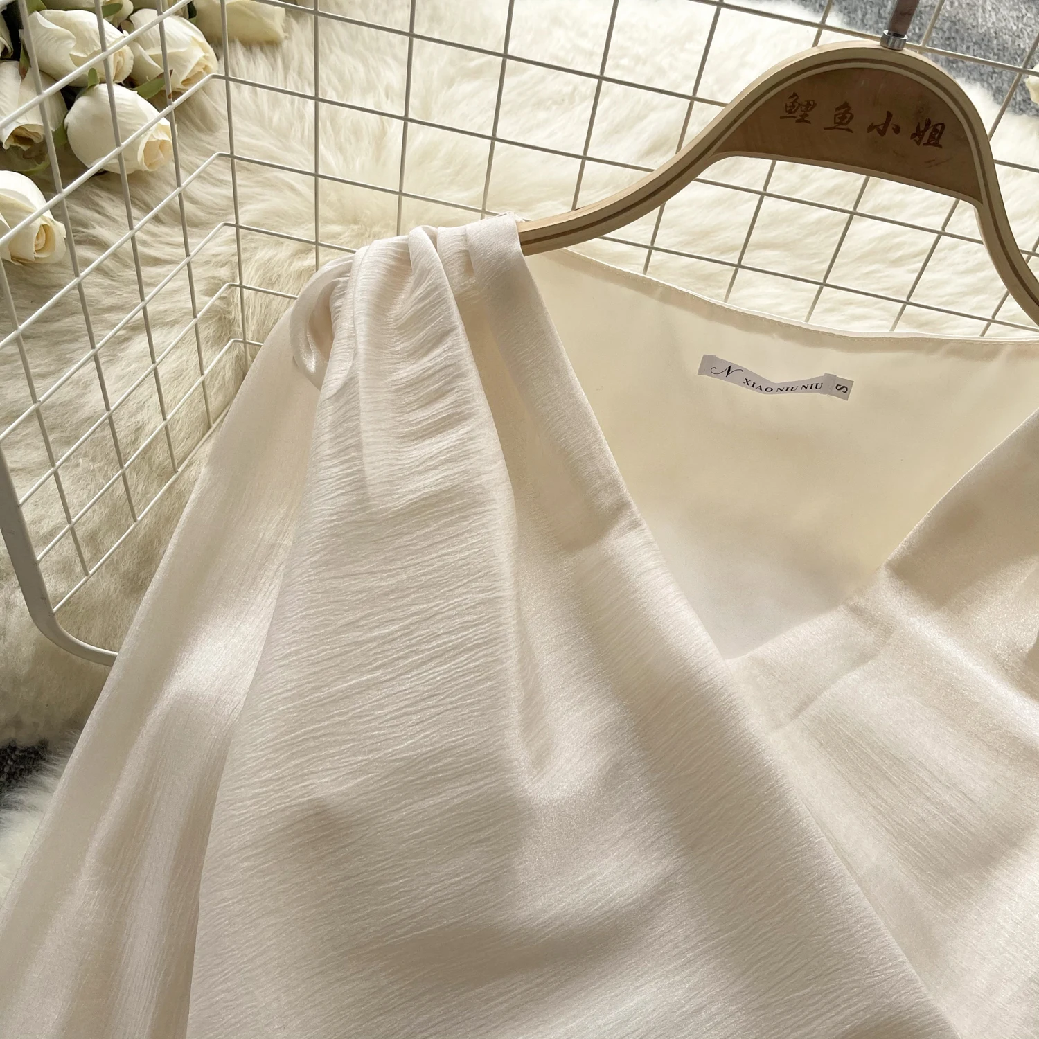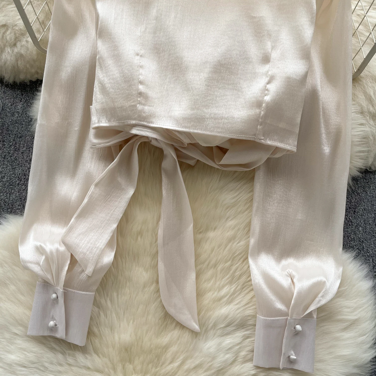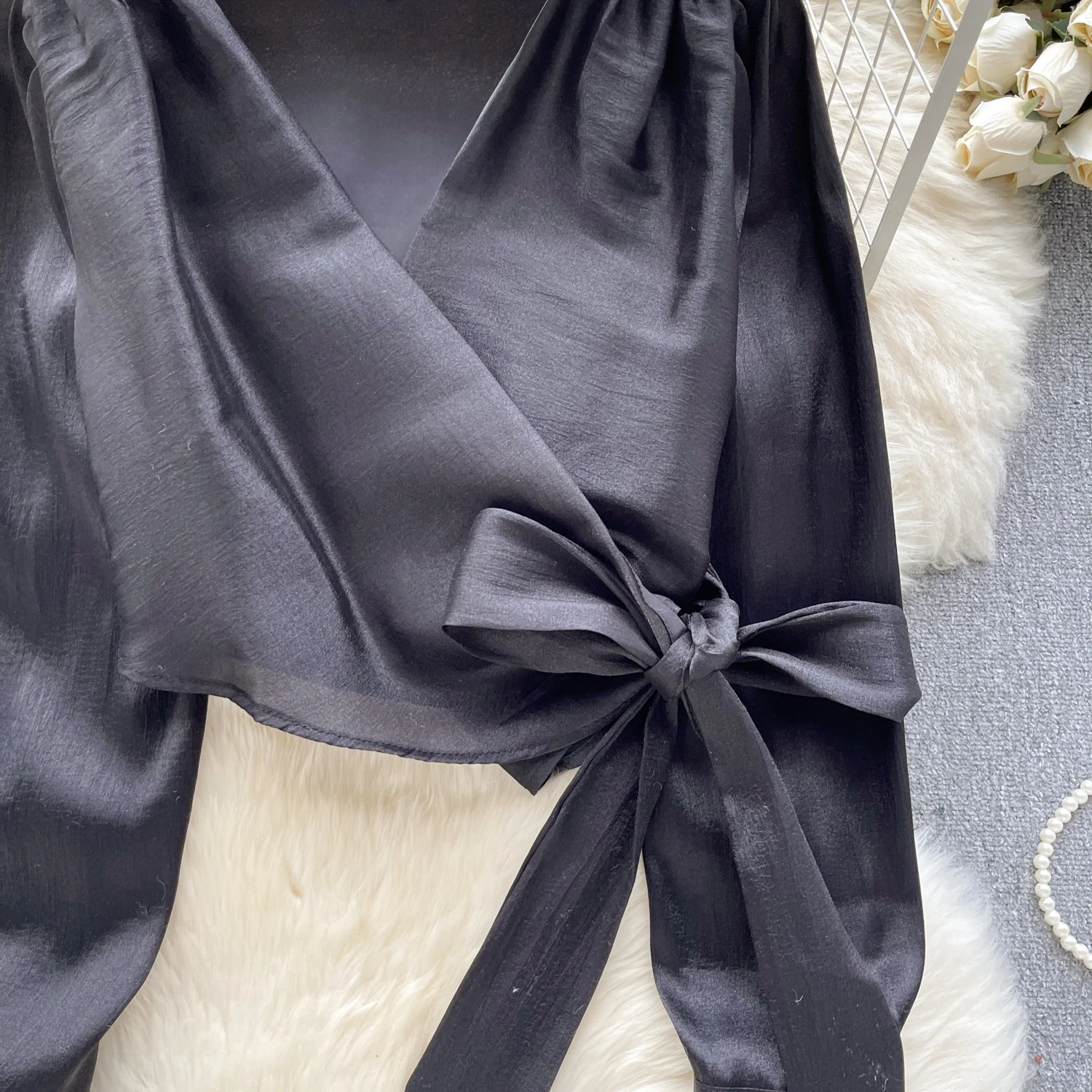 Sea el primero en opinar “Camisa de vendaje con lazo cruzado Beige para mujer, ropa de diario francesa, Tops cortos formales con cuello en V, blusa elegante de moda, nuevo, otoño”