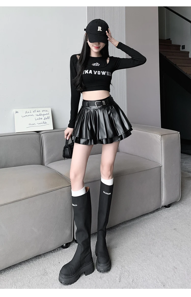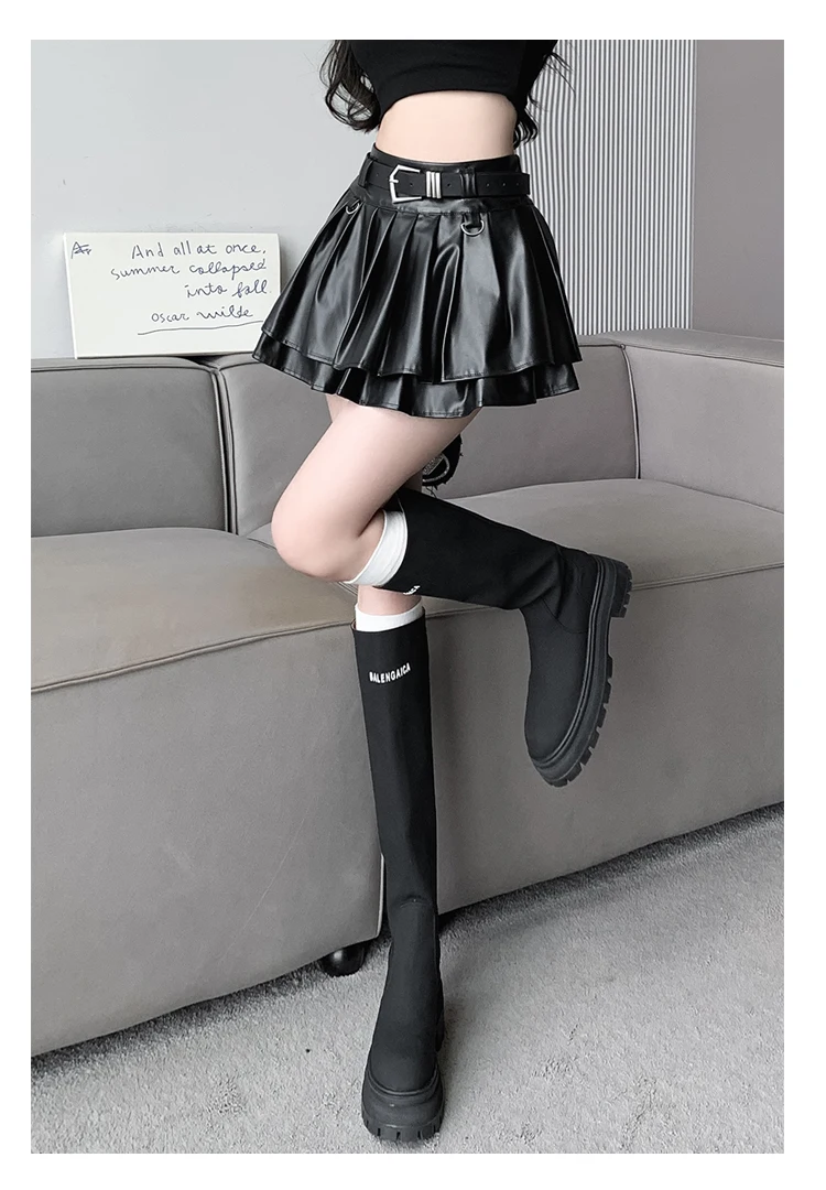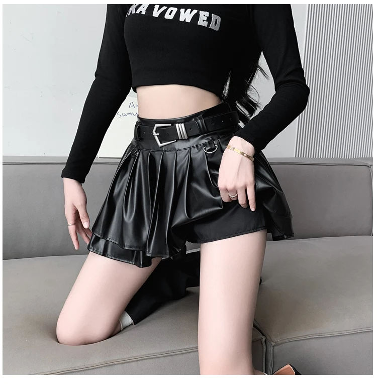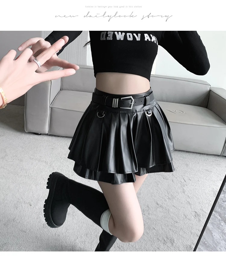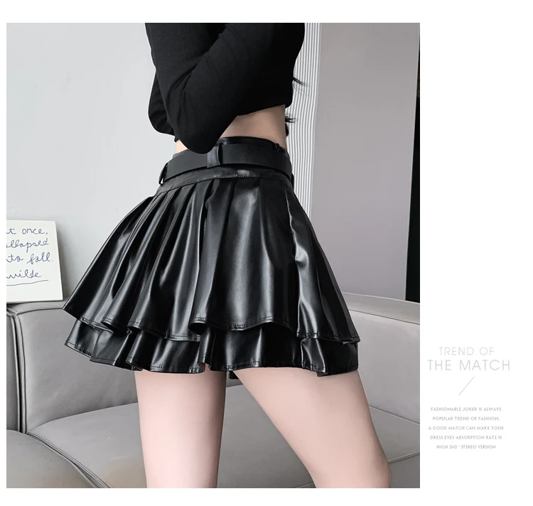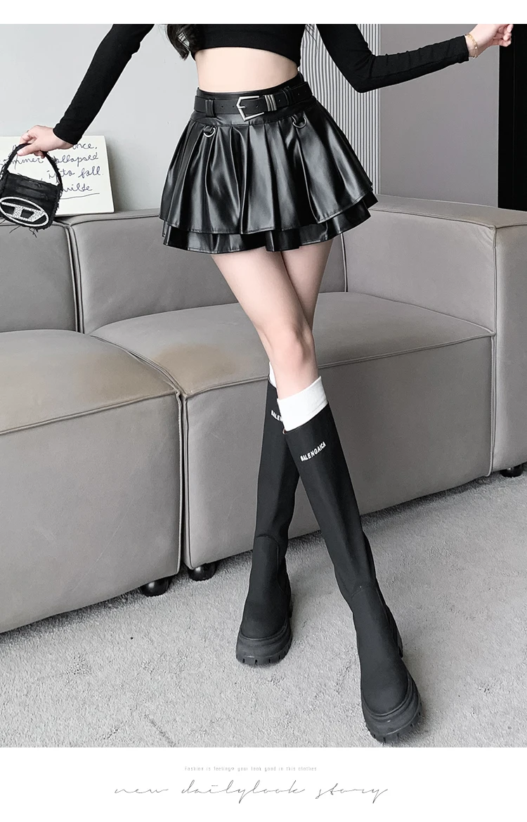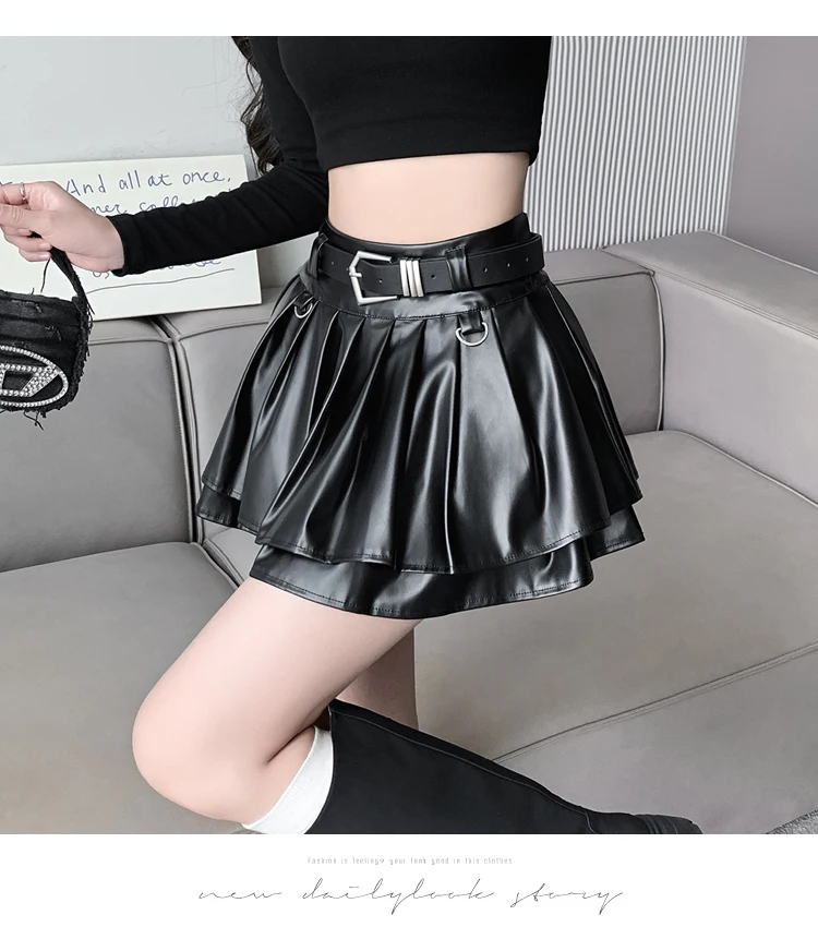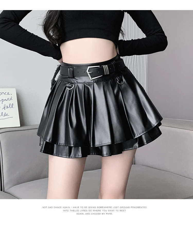 Sea el primero en opinar “Falda plisada de cuero Pu con cinturón para mujer, vestido de baile de cintura alta, línea A delgada, color negro, otoño e invierno”