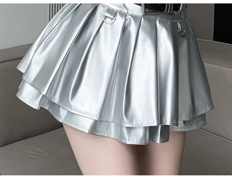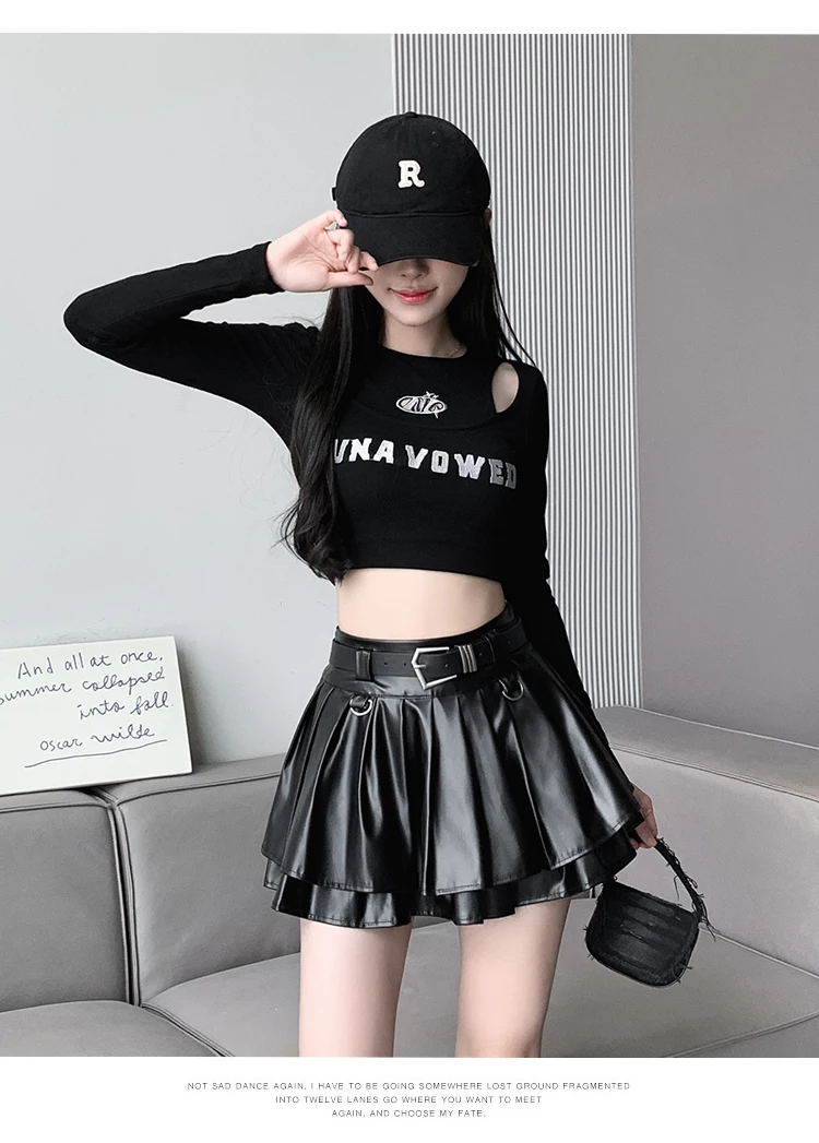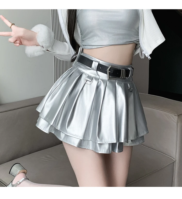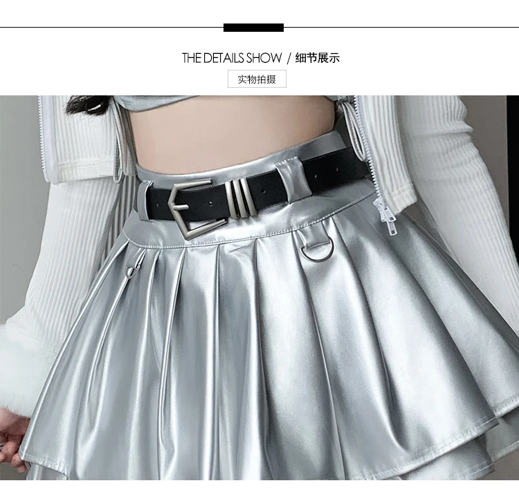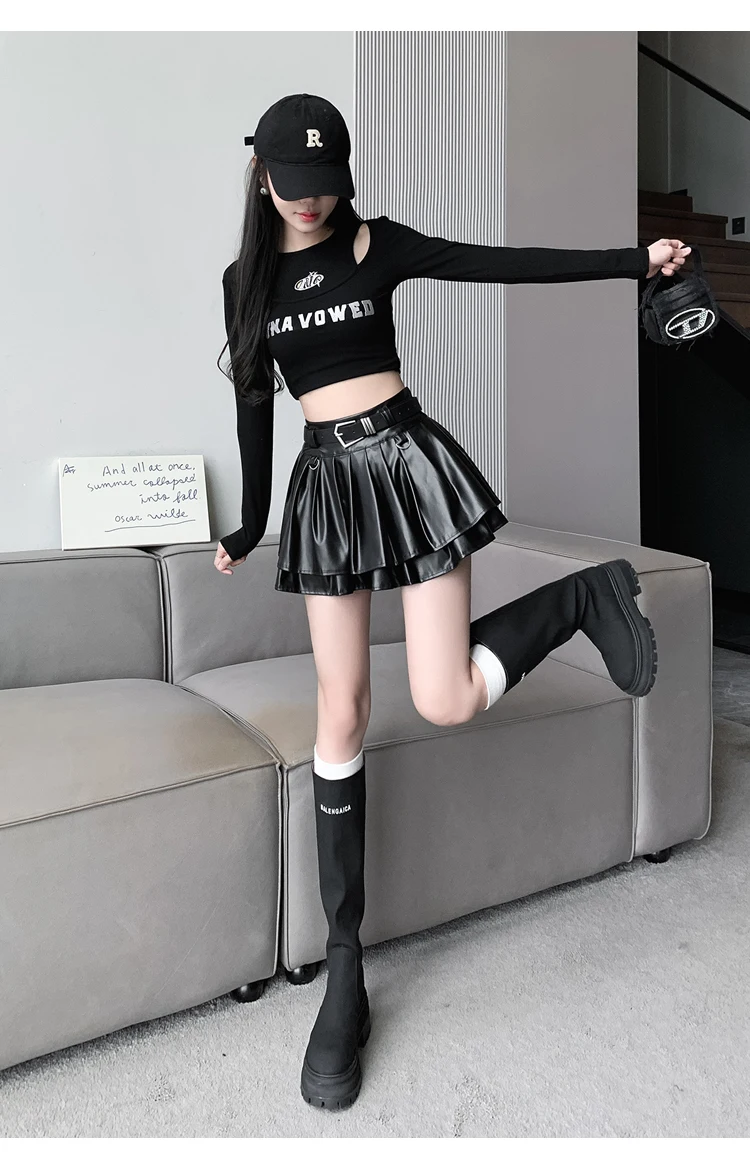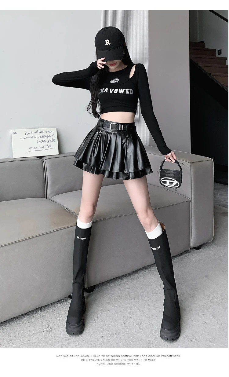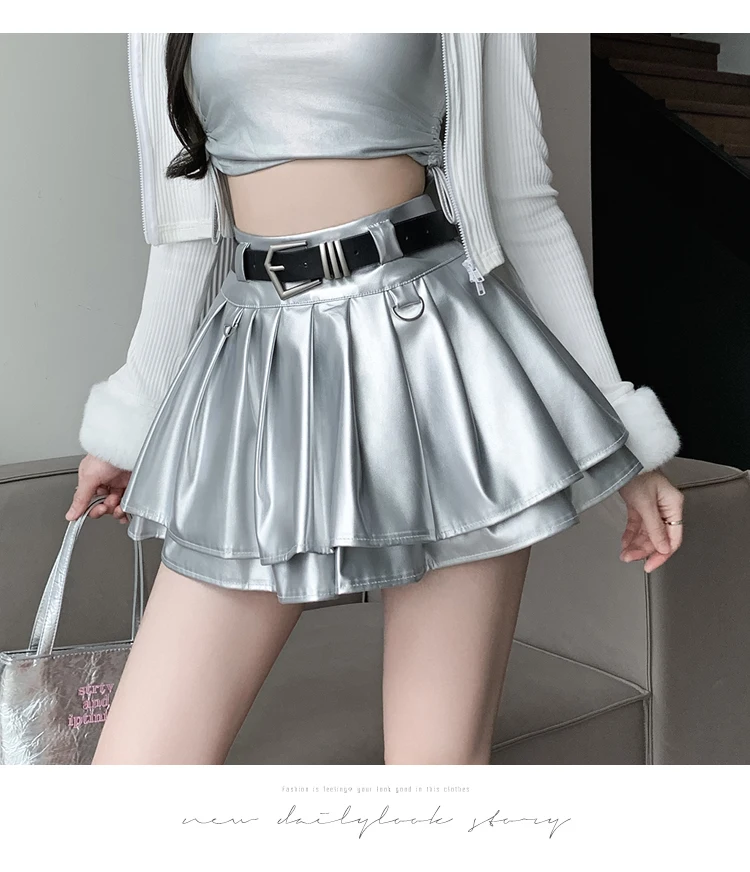 Sea el primero en opinar “Falda plisada de cuero Pu con cinturón para mujer, vestido de baile de cintura alta, línea A delgada, color negro, otoño e invierno”