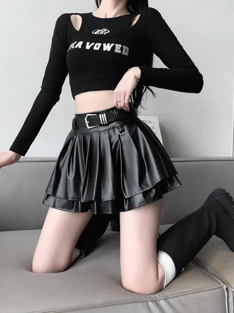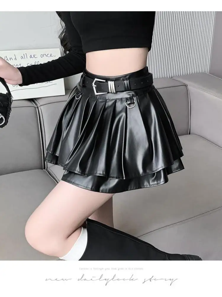 Falda plisada de cuero Pu con cinturón para mujer, vestido de baile de cintura alta, línea A delgada, color negro, otoño e invierno