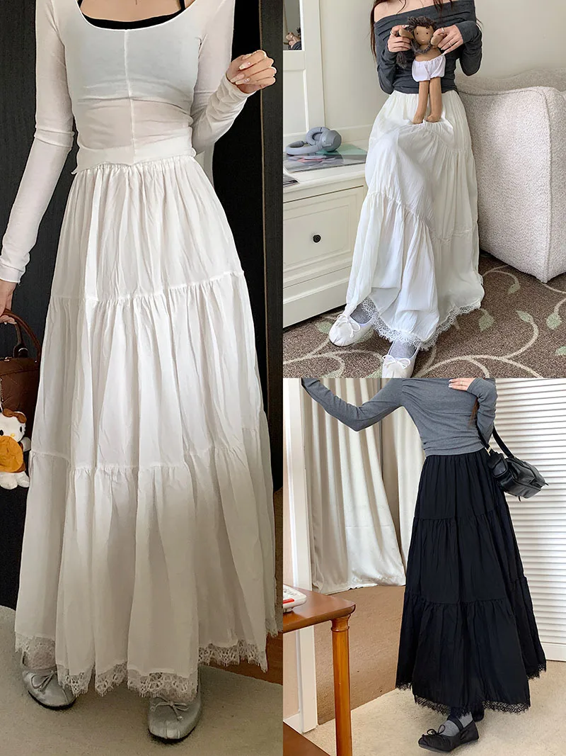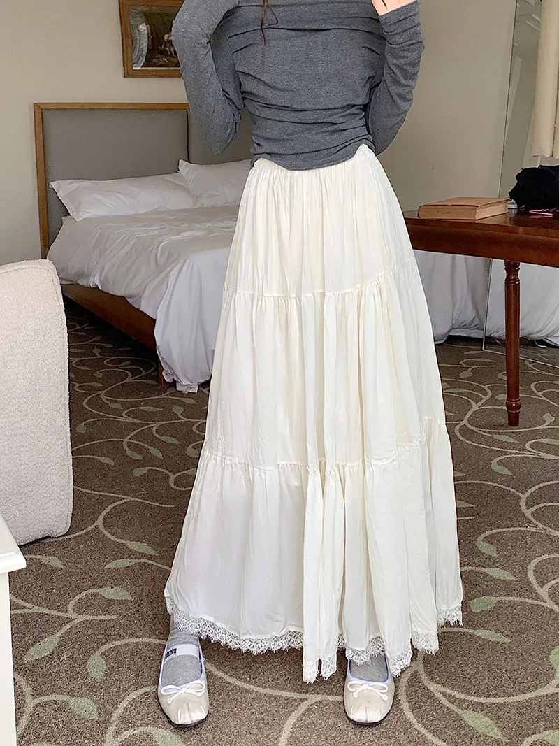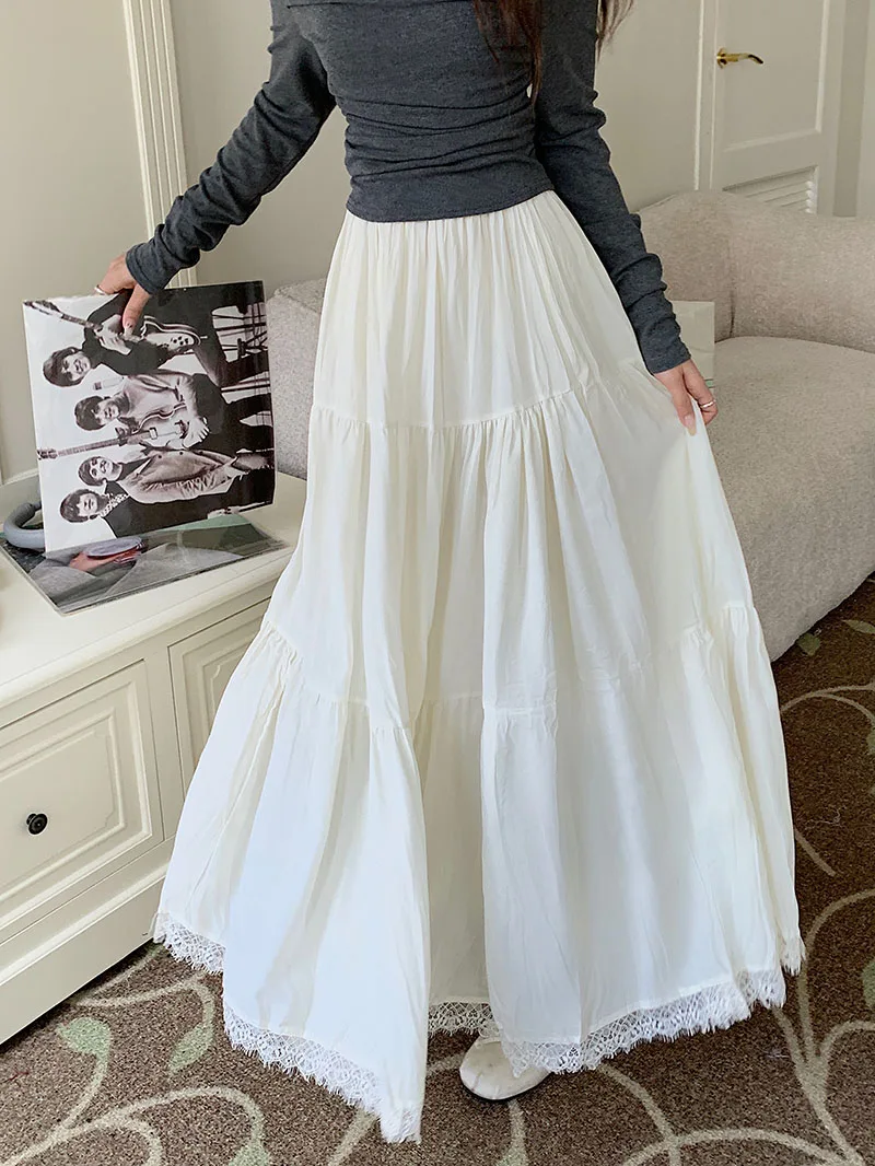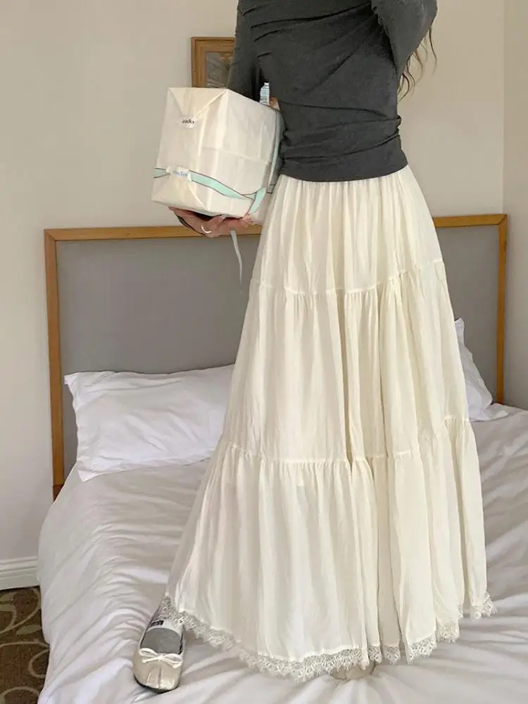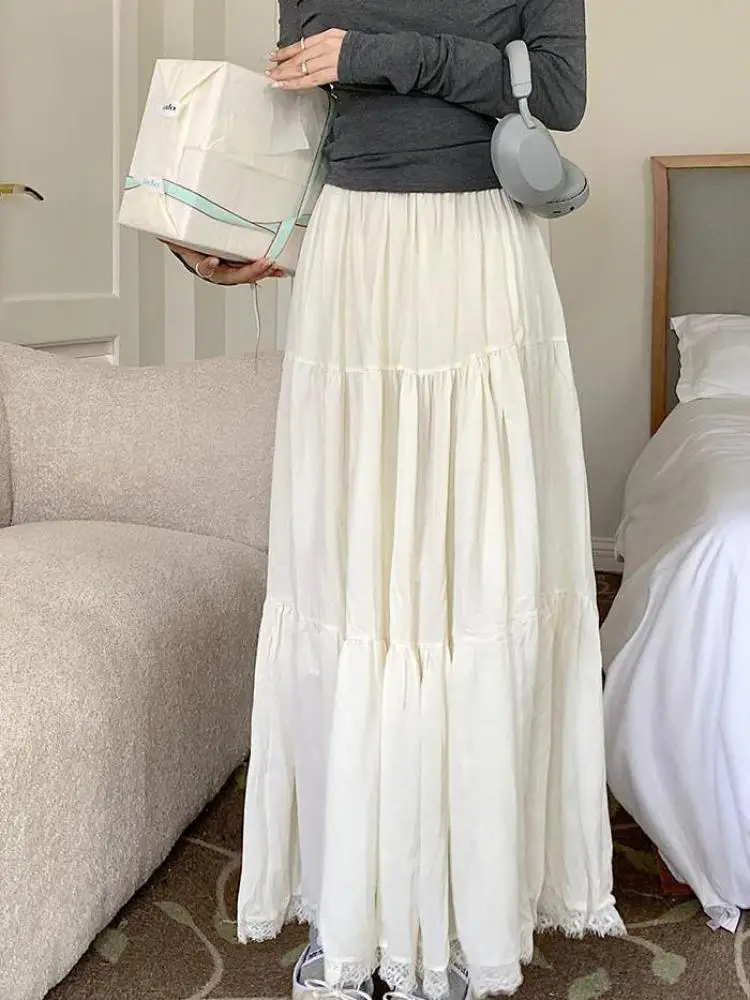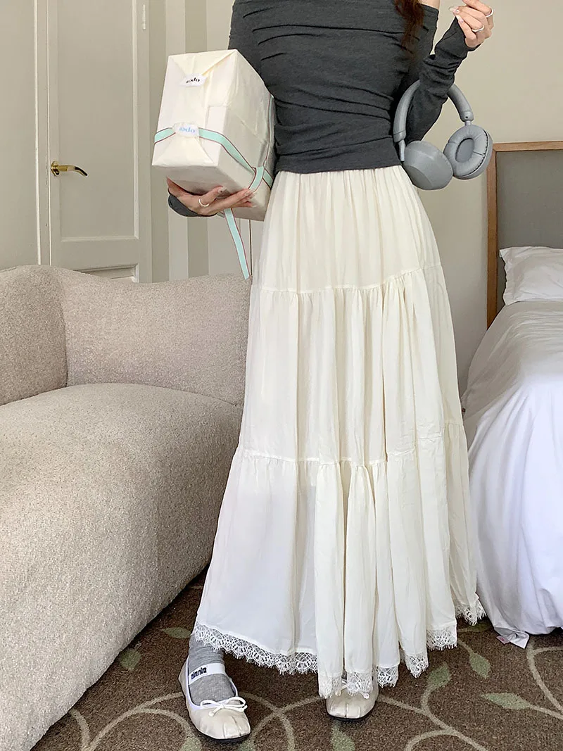 Faldas largas plisadas blancas francesas para mujer, falda de encaje negro, moda de primavera y verano, falda dulce Beige elástica de cintura alta, falda acampanada