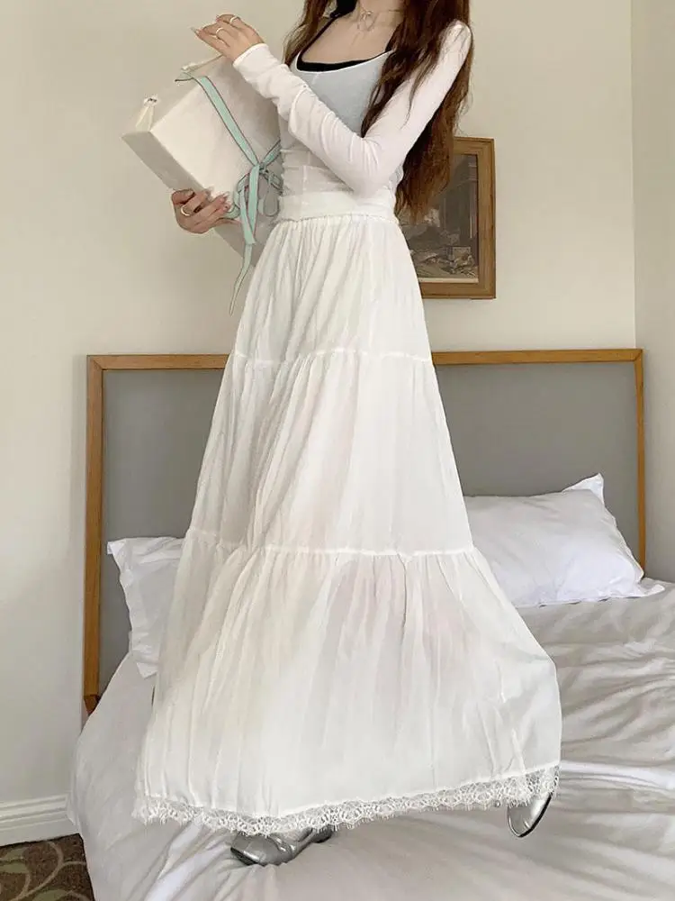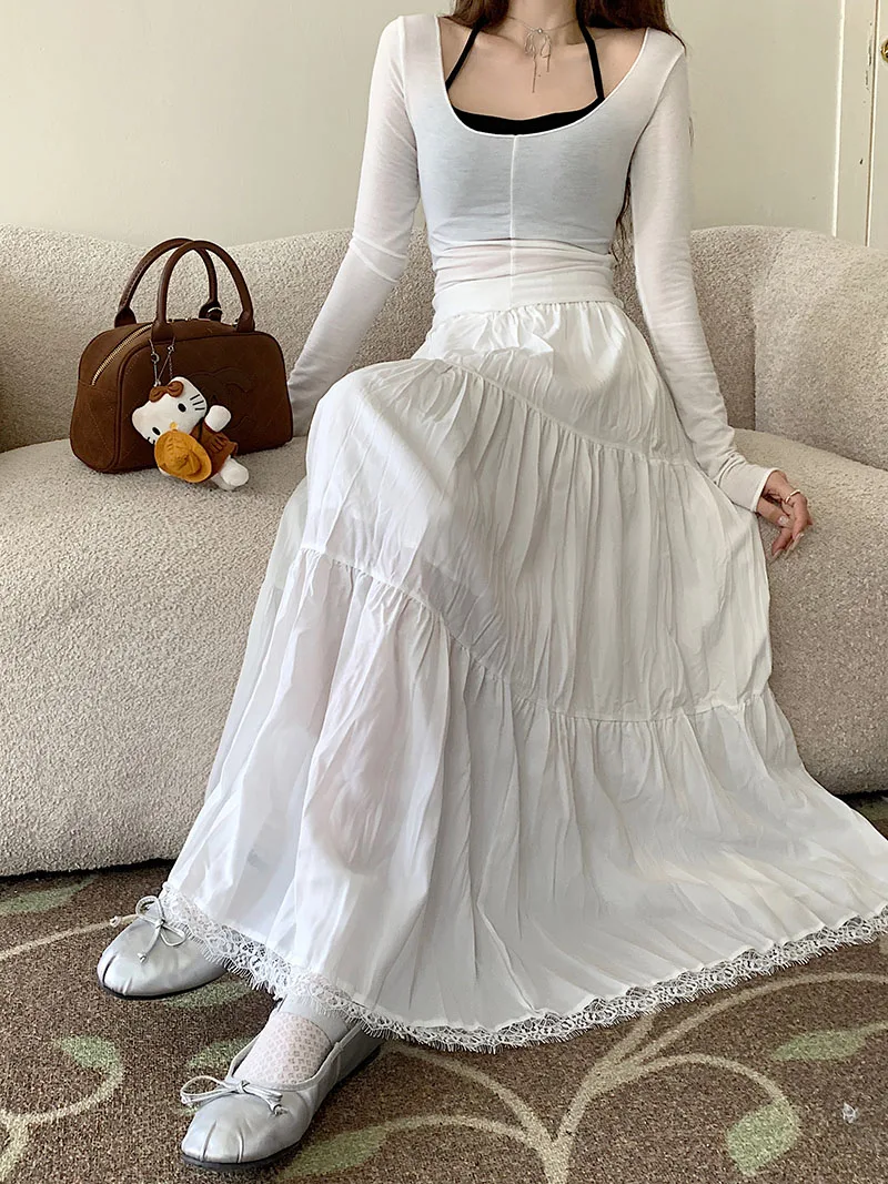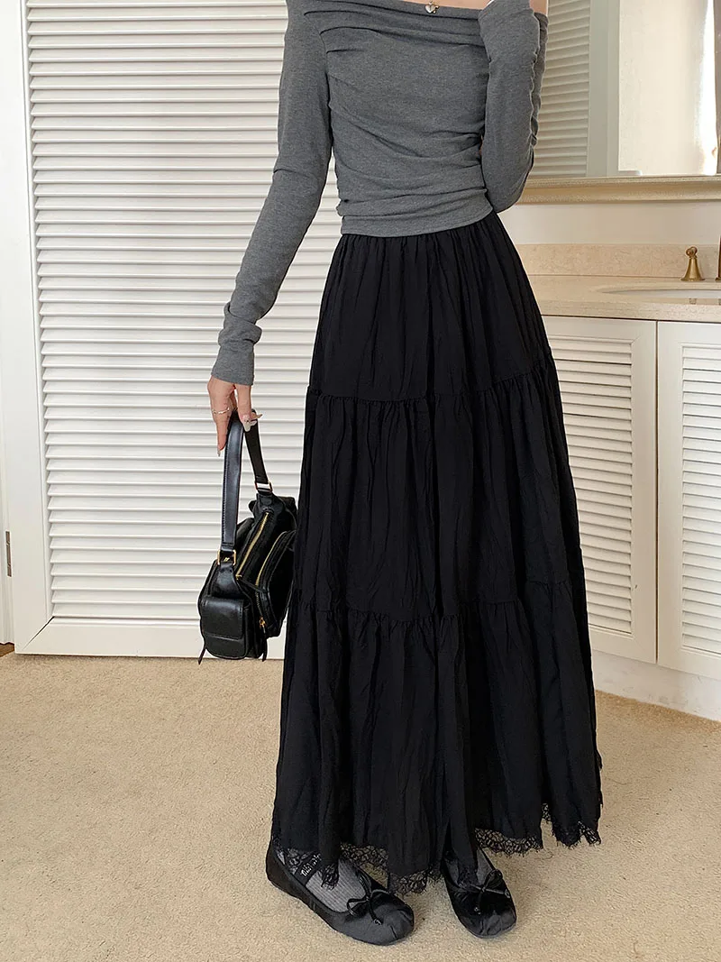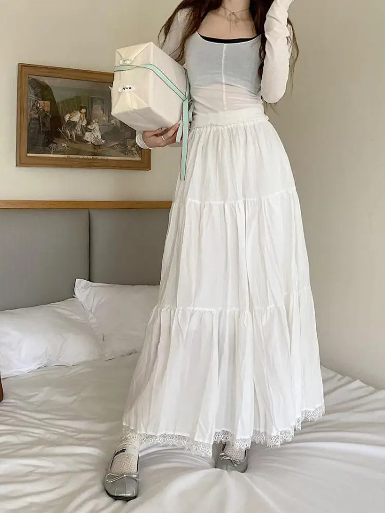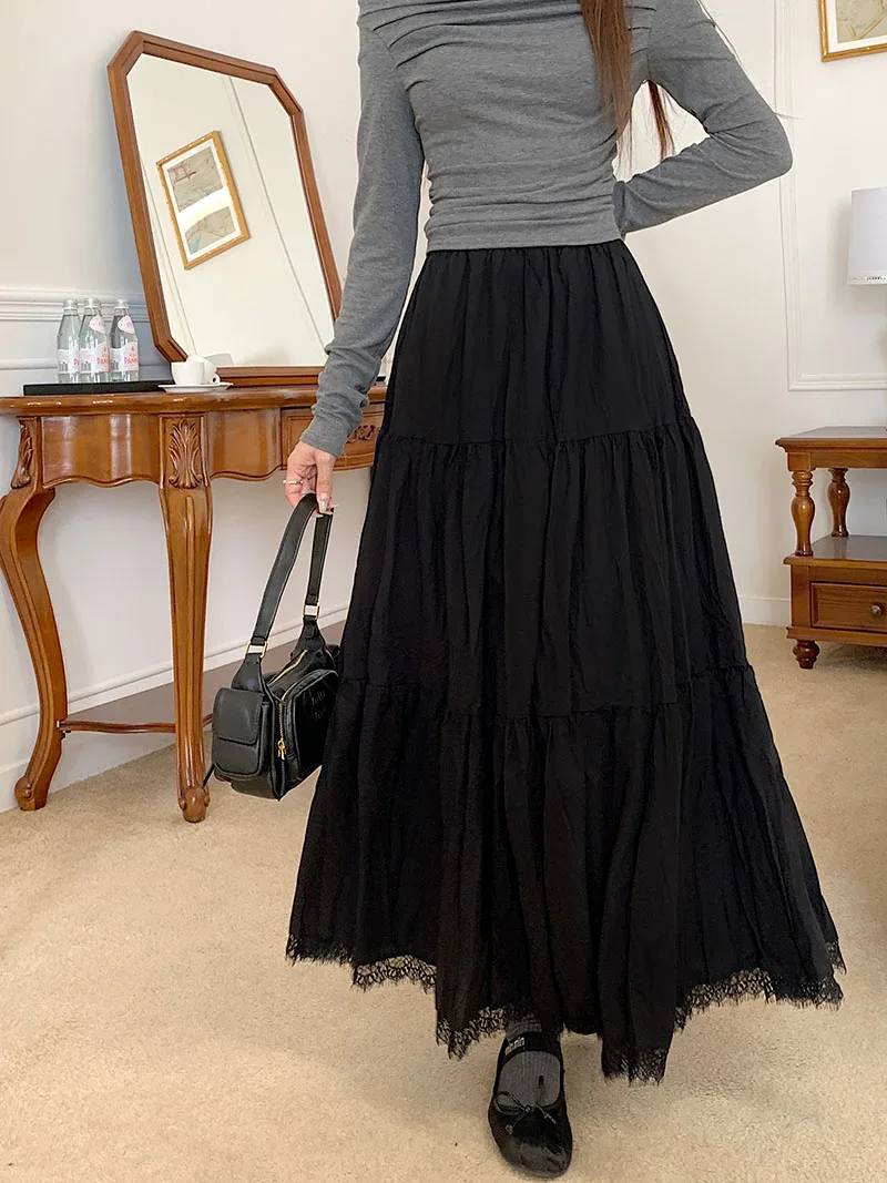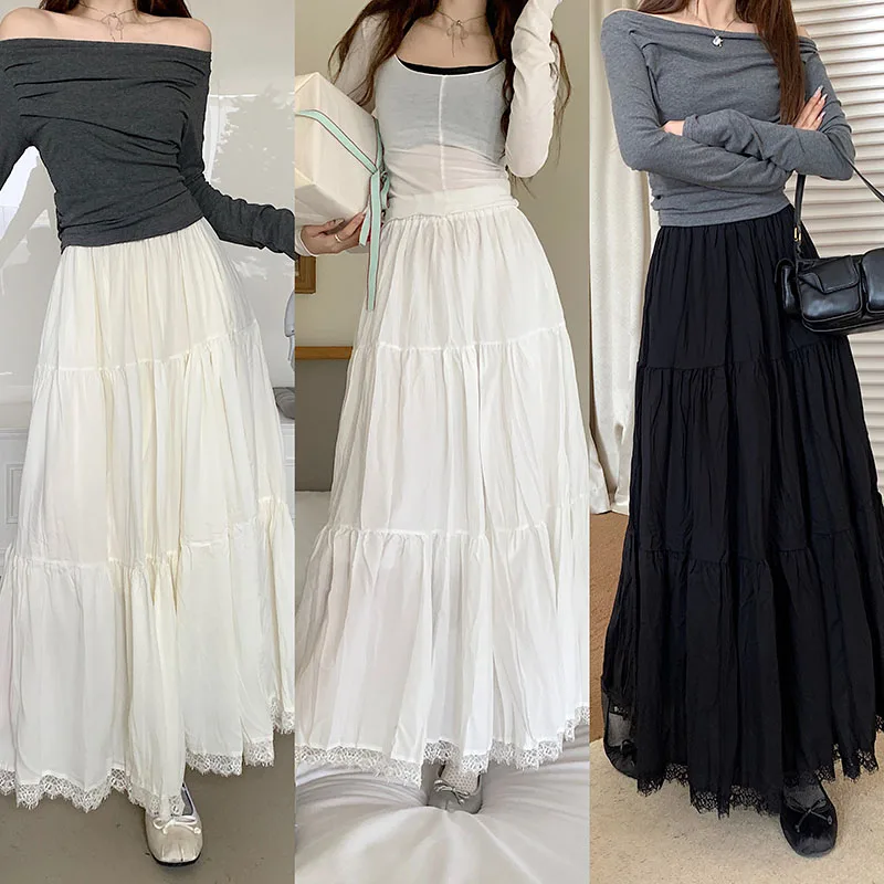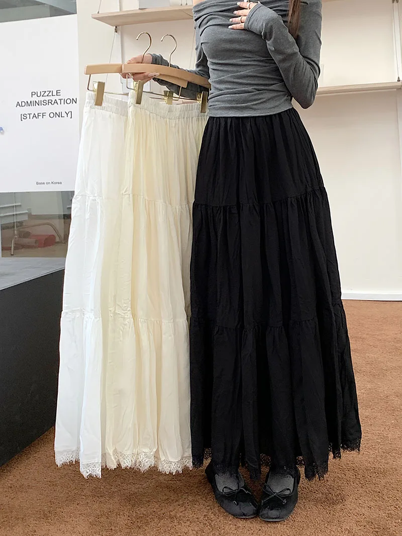 Faldas largas plisadas blancas francesas para mujer, falda de encaje negro, moda de primavera y verano, falda dulce Beige elástica de cintura alta, falda acampanada