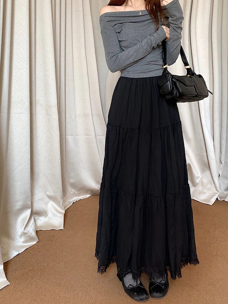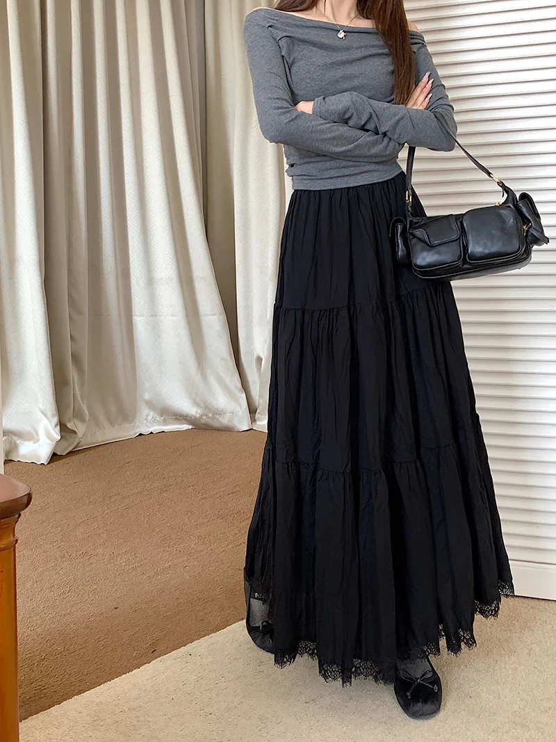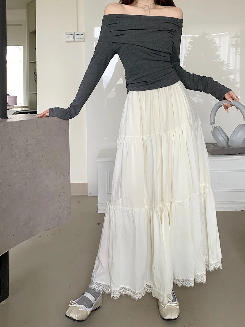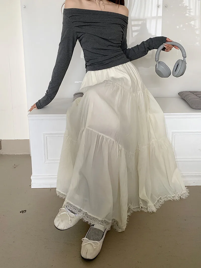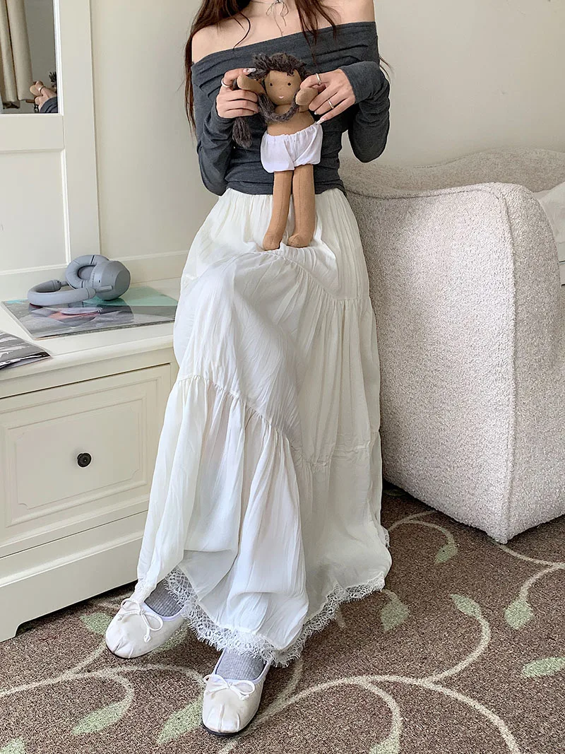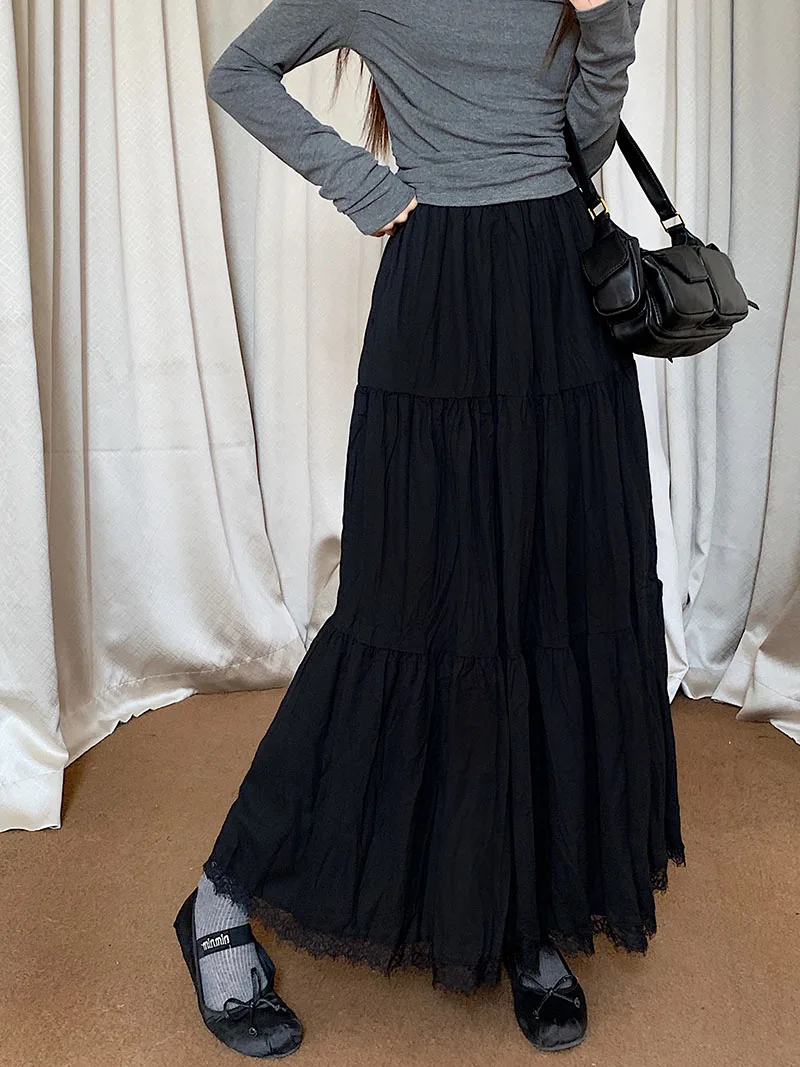 Faldas largas plisadas blancas francesas para mujer, falda de encaje negro, moda de primavera y verano, falda dulce Beige elástica de cintura alta, falda acampanada
