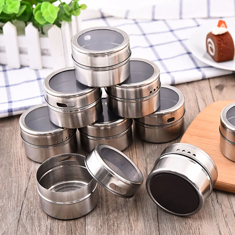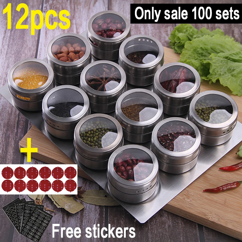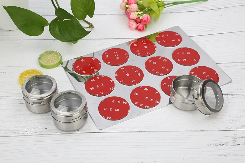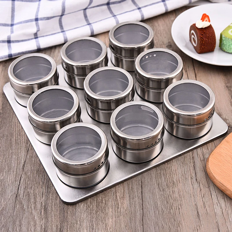 Tarros magnéticos para especias con soporte de pared, latas de acero inoxidable para especias, recipientes para condimentos con etiqueta para especias y base para almacenamiento de alimentos.