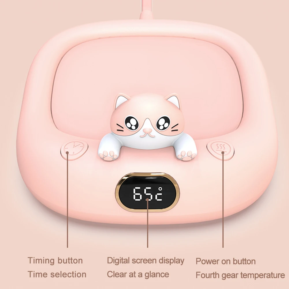 Posavasos termostático inteligente de 65 grados, sin BPA, 220 V, con pantalla digital, con diseño de gato de dibujos animados, ajuste TEM de 4 velocidades, apagado automático de 8 horas para uso en la oficina y en el escritorio del hogar