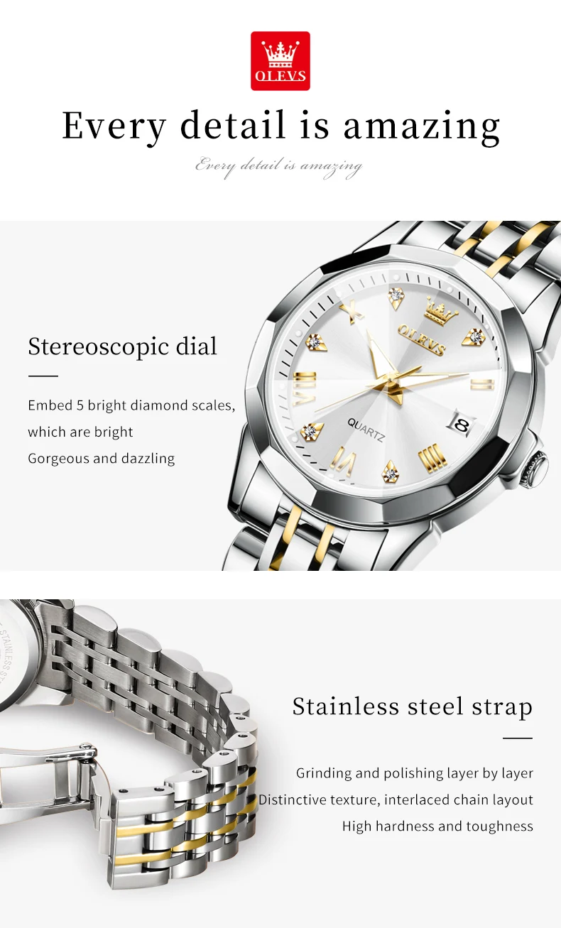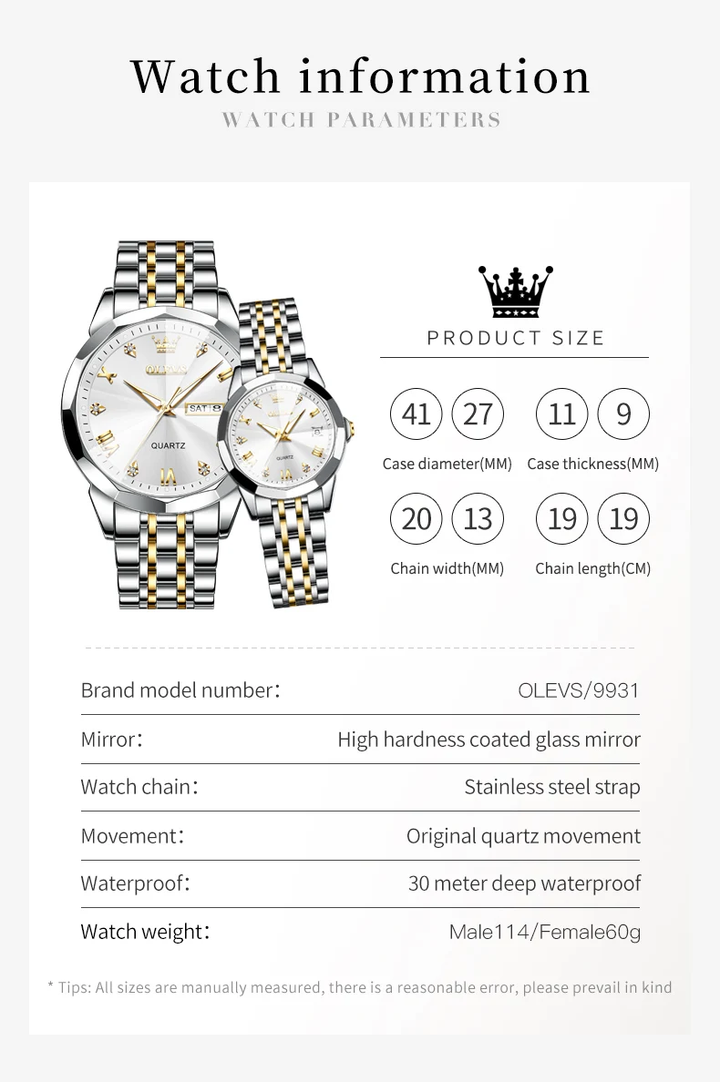 Reloj de cuarzo OLEVS para pareja, conjunto de lujo de acero inoxidable impermeable para hombres y mujeres, relojes para amantes, reloj de pulsera para parejas, caja de regalo